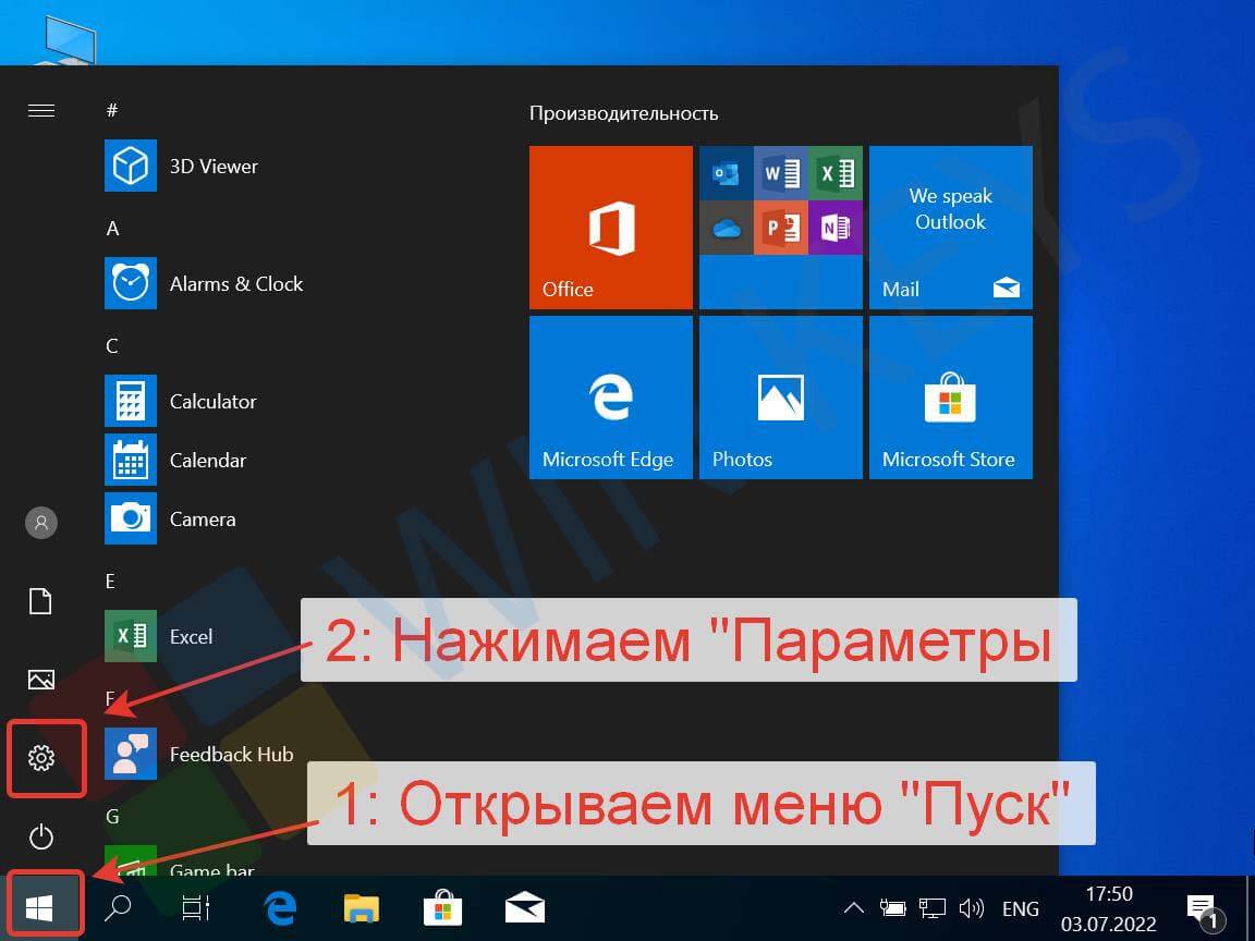 Откройте «Пуск» и перейдите в «Параметры».