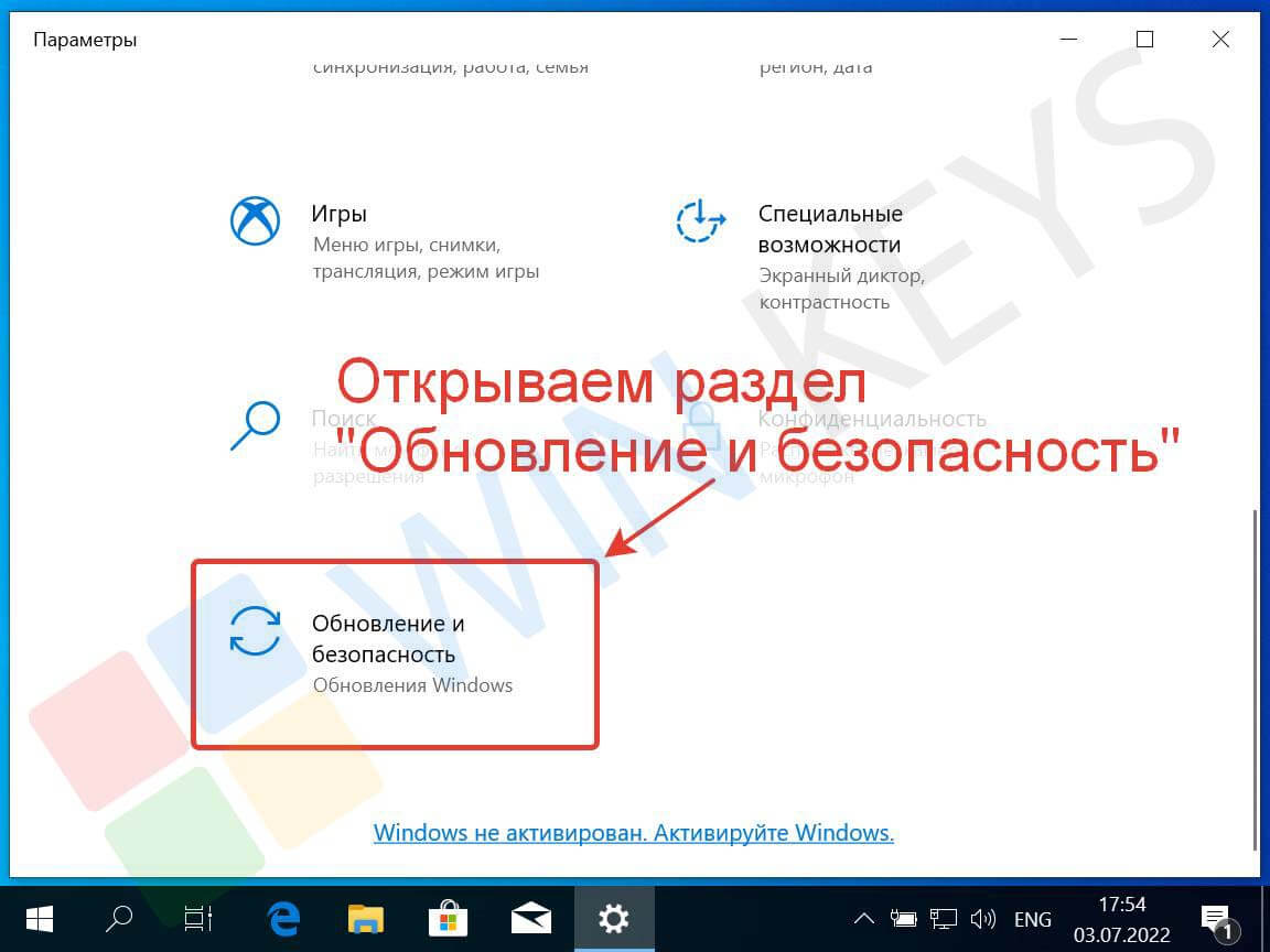 В окне параметров откройте раздел «Обновление и безопасность».