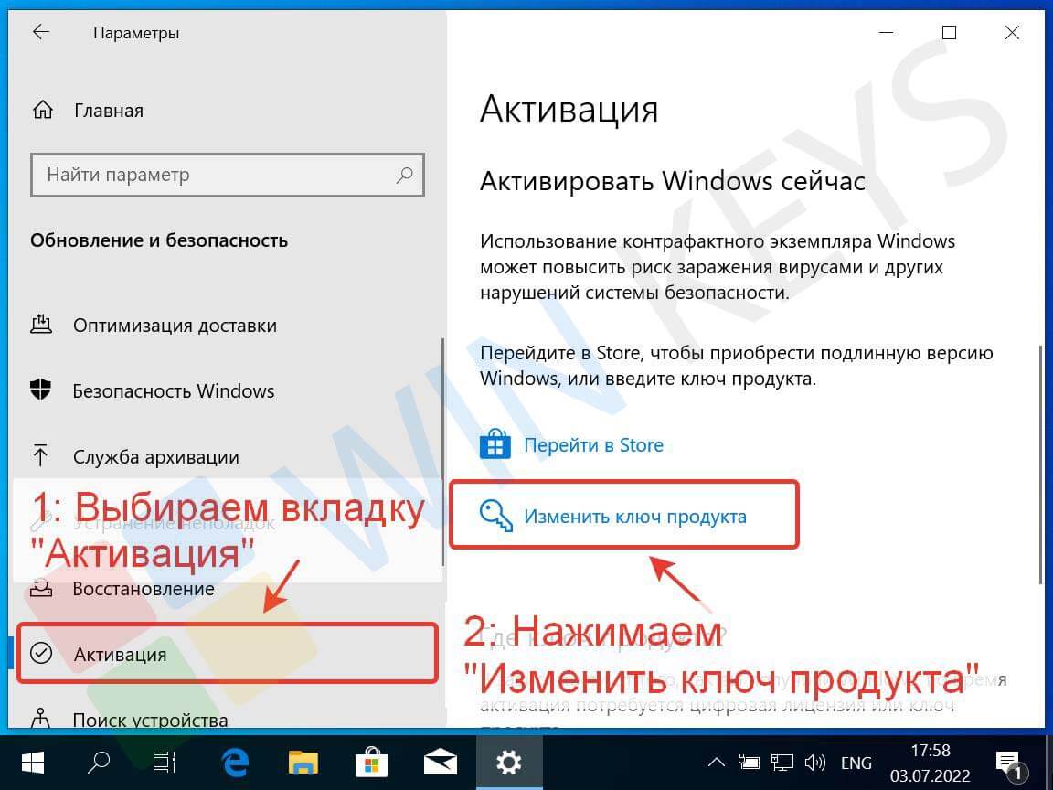 Откройте вкладку «Активация» и нажмите «Изменить ключ продукта».
