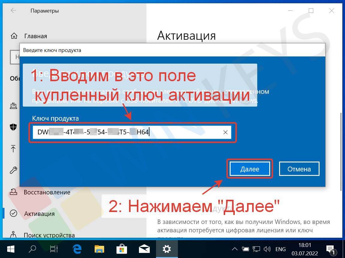 Введите 25-значный ключ, который вы получили на почту после покупки, и нажмите Далее.