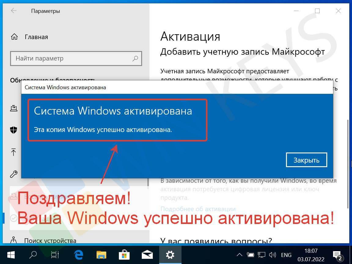 Поздравляем — Windows 10 успешно активирована. Убедитесь, что статус в разделе «Активация» обновился.
